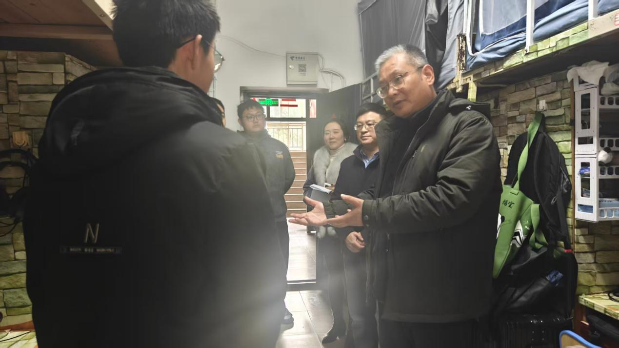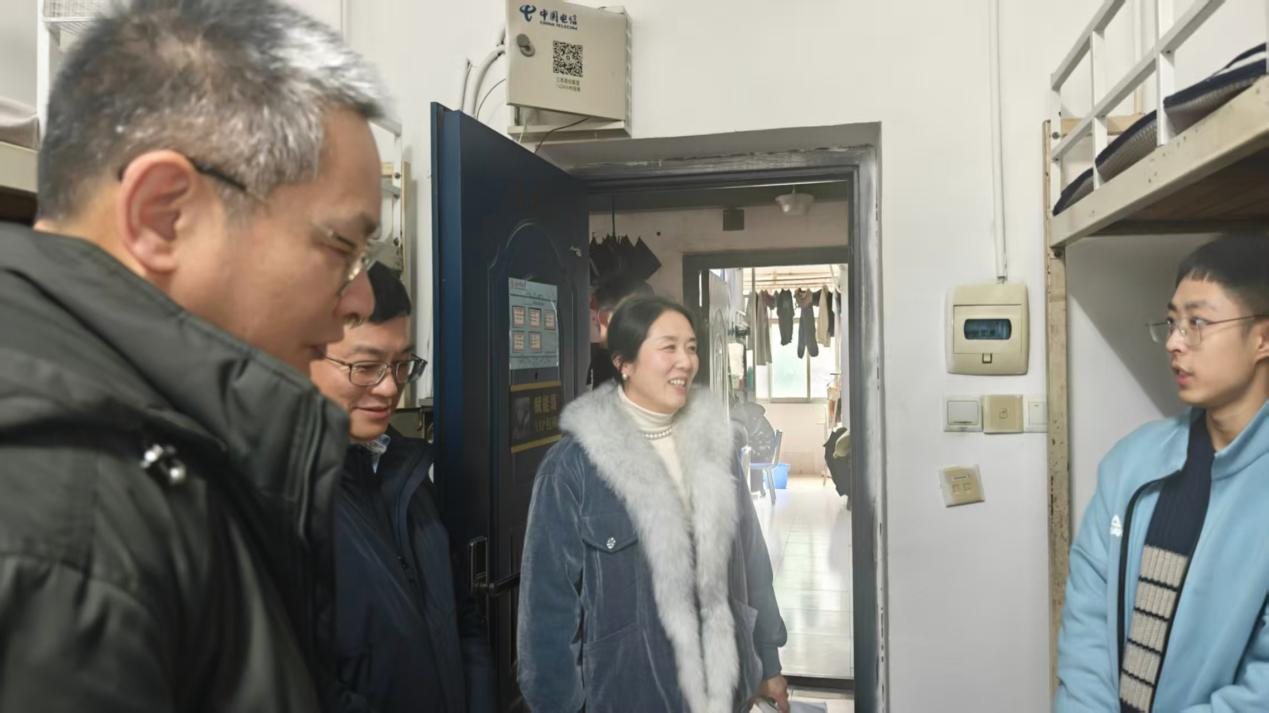 走访过程中,薛锦春一行与同学们亲切沟通、深入交流,不仅详细询问大家寒假在家的生活状态、假期学习与实践安排,还关切了解新学期开学后的学习计划、宿舍生活重新适应情况,耐心倾听同学们在校园生活、专业学习中遇到的困惑与实际需求。薛锦春嘱咐同学们,要快速收心归位,调整好作息与学习状态,合理规划新学期时间,养成良好的学习和生活习惯;室友之间要互帮互助、和睦相处,共同营造整洁和谐、积极向上的宿舍氛围。兰新华鼓励大家,要珍惜宝贵的大学时光,在扎实学好专业知识、夯实专业基础的同时,积极发掘并拓展兴趣爱好,主动参与志愿服务和各类校园活动,在实践中不断提升自身综合素养,努力成长为符合社会需求的高素质软件人才。