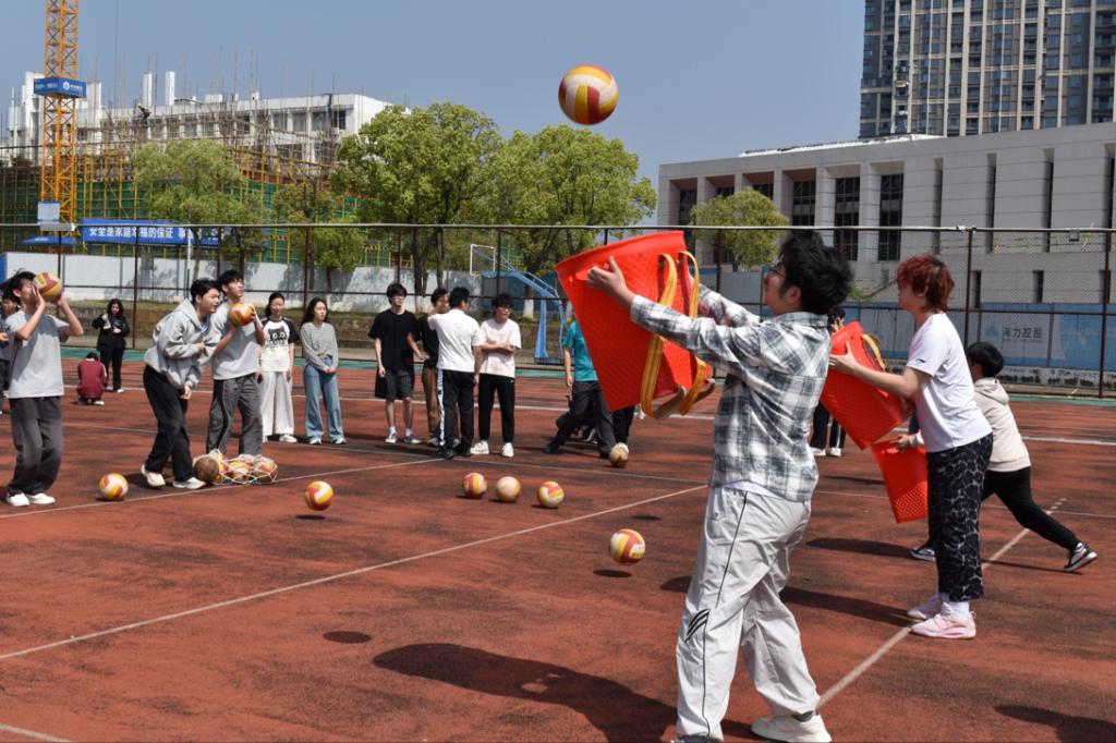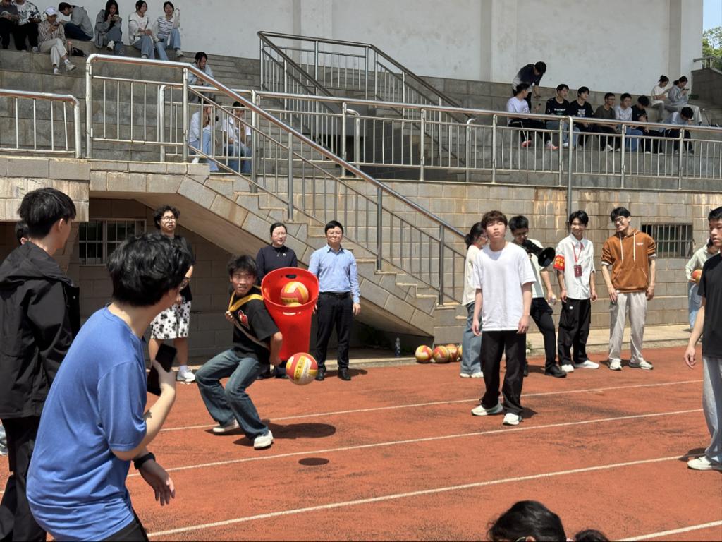 “金石投趣”项目现场,同学们手持彩球,瞄准目标桶奋力投掷。这一项目呼应了稀土矿物勘探中“精准定位、高效采集”的专业内涵,考验着同学们的专注力与精准度。有的同学屏息凝神,一击即中;有的同学虽略有偏差,却也在同伴的鼓励中调整状态,继续尝试。