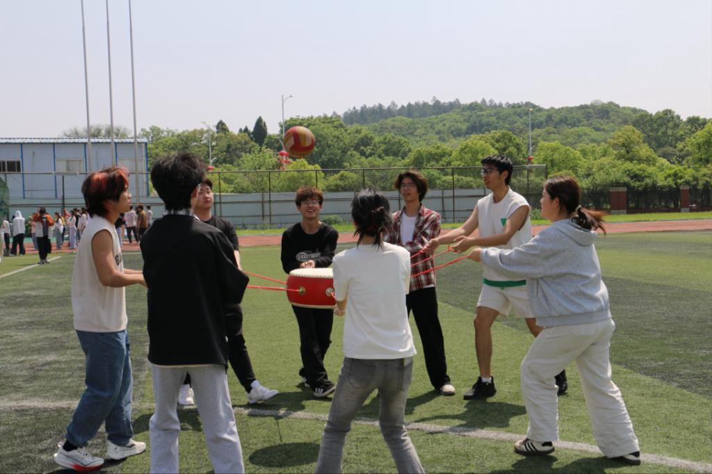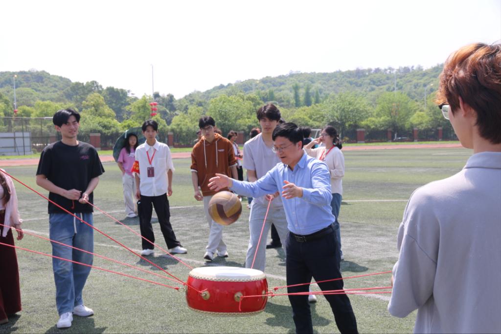 “钨金战鼓”项目堪称全场最具节奏感的挑战!几名同学手牵绳索,共同控制一面红鼓,配合着将鼓上的排球连续颠起。这正如稀土加工中“精准控制、协同操作”的工序,需要所有人节奏统一、力度均衡,才能让排球在鼓上平稳跳跃。大家眼神紧盯排球,双手随着节奏拉动绳索,每一次颠球的成功都伴随着集体的欢呼,失误时也会互相打气,在一次次磨合中找到团队的节奏。