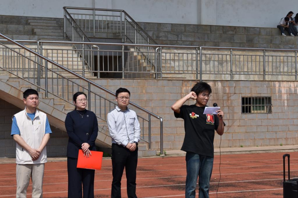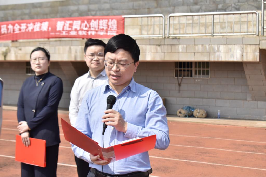 全场肃立,奏唱国歌,五星红旗冉冉升起,仪式庄重肃穆。兰新华致开幕辞,向运动会表示祝贺,勉励全体运动员顽强拼搏、赛出风格,期待大家在运动中凝聚力量、展现青春朝气。随后,运动员代表陈宁上台庄严宣誓,承诺严守比赛规则,秉持体育精神,文明参赛、公平竞争,赛出风格与水平。裁判员代表赖文涛上台庄严宣誓,承诺恪守裁判职责,秉公执裁、公正严明,维护赛事公平公正。在全场热烈的欢呼声中,兰新华庄重宣布:工业软件学院2026春季趣味运动会正式开幕!