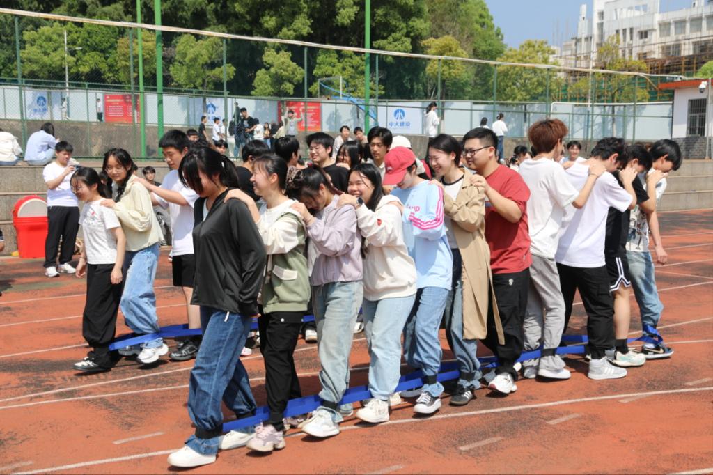 “同炉共进”项目中,同学们脚踩蓝色绑带,肩搭彼此的肩膀,组成一列整齐的“小火车”,向着终点同步迈进。正如稀土冶炼中“同炉共炼、协同反应”的过程,只有步伐一致、心往一处想、劲往一处使,才能稳步向前。赛场上,大家喊着整齐的口号,从一开始的磕磕绊绊到后来的默契十足,每一步都凝聚着团队的信任与配合,跑道上回荡着大家的笑声与加油声。