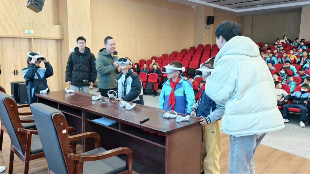 抵达双港学校后,党员们充分发挥专业优势开展科普服务。蔡晓丽以“虚拟建房”为主题,带领孩子们走进建筑科技的奇妙世界;江南的“魔法影视”课堂,用趣味讲解揭开影视特效的神秘面纱;王潇涵围绕网络世界“红绿灯”展开科普,帮助孩子们树立正确的网络安全意识。虚拟现实设备体验环节更是将活动氛围推向高潮,孩子们亲手操作设备,沉浸式感受前沿科技的魅力,现场欢声笑语不断。