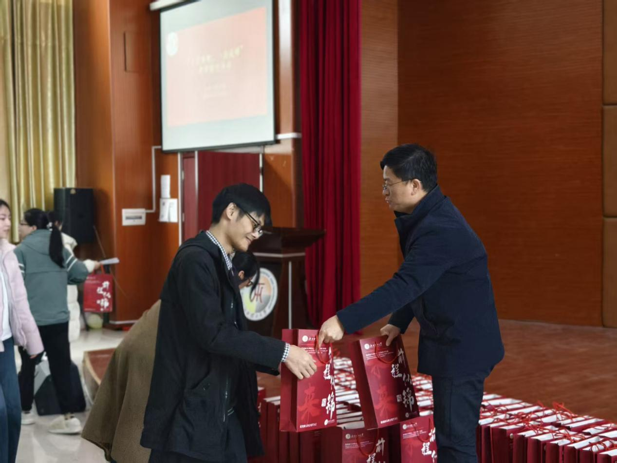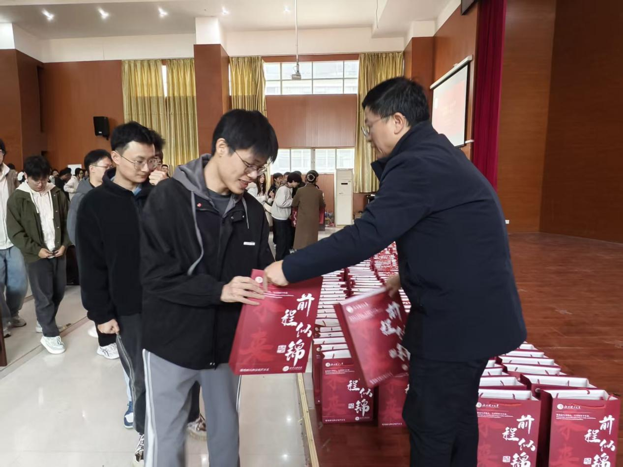 本次活动主要分为两个环节。首先由兰新华致辞,他对全体考研学子日复一日的坚持与付出表示肯定与慰问,鼓励大家在最后的冲刺阶段坚定信念、调整心态,以沉着冷静的姿态迎接挑战,同时叮嘱同学们注重劳逸结合,保持良好的身心状态。然后,兰新华为考研学子分发学院精心准备的内含励志书签、文具套餐、能量礼包等物品的“考研助力大礼包”,用切切实实的支持为考研学生加油鼓气。同学们接过助力包,纷纷表示将把学院的关怀转化为备考的动力,不负学院的期望与厚爱。
