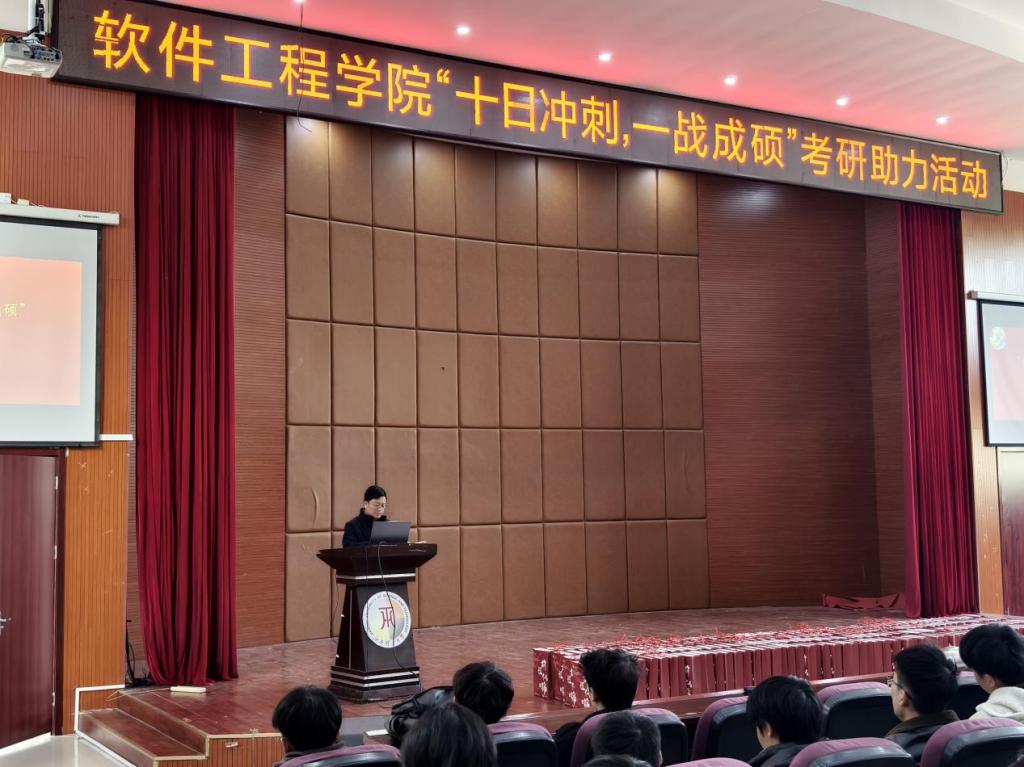 本网讯(文/贾璐 图/陈科皓) 为切实关心考研学子备考状态,缓解备考压力,12月10日中午,软件工程学院于一教报告厅举办主题为“十日冲刺,一战成硕”考研助力活动,学院党委副书记(主持工作)兰新华、就业辅导员游珊与备战考研的同学们齐聚一堂,共同参与本次助力活动。