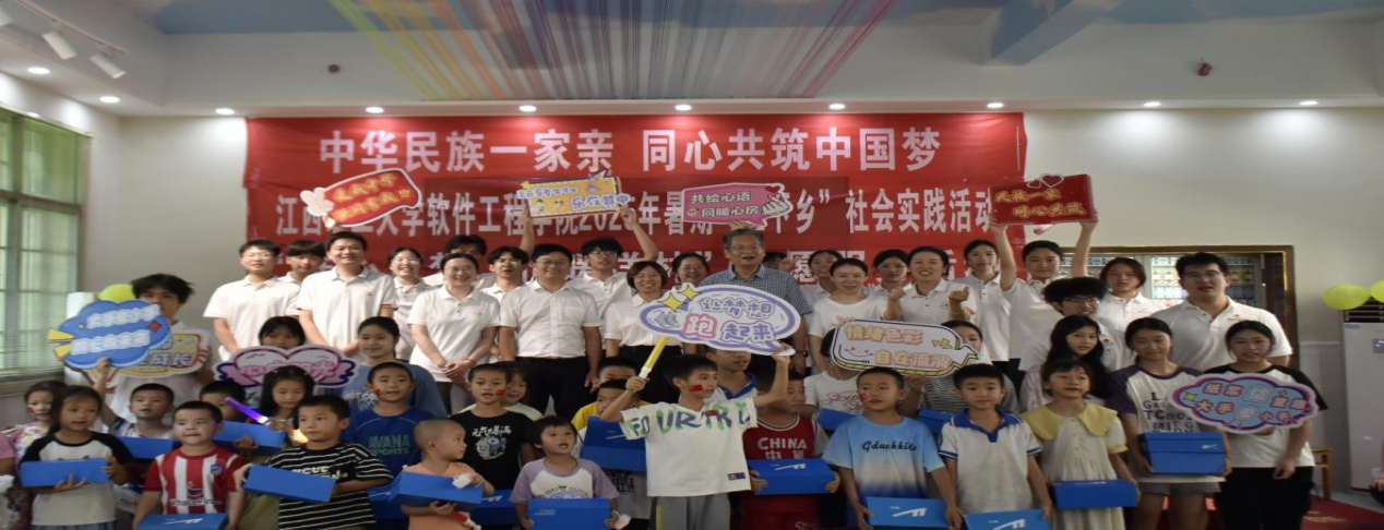 News Network (Article/Xie Tingyi ;Photos/Liu Xu Review/Fang Yating) On the afternoon of July 11, leaders of the School of Software Engineering, Jiangxi University of Science and Technology, led the "Yima Dangxian" summer "Three Goes to the Countryside" social practice team to successfully hold the unveiling ceremony of the College Student Volunteer Service and Social Practice Center and the charity donation activity themed "Bring New Shoes Back to Hometown, Let Dreams Run Forward" in Yanglin Village, Aoshan Town, Shanggao County. Xue Jinchun, Dean of the School, Lan Xinhua, Deputy Secretary of the Party Committee of the School (in charge of daily work), Wu Qiong, Secretary of the Communist Youth League Shanggao County Committee, Huang Shan, Deputy Mayor of Aoshan Town, Shanggao County, Ye Qiren, Director of the Public Security and Security Committee of Yanglin Village, Fang Yating, Director of the Student Affairs Office and Secretary of the Youth League Committee of the School, Fang Yu, Secretary of the First Party Branch of Undergraduates, and all members of the practice team participated in the activity.