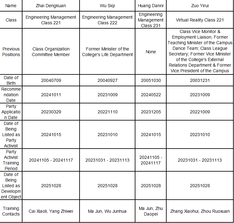 In accordance with the relevant provisions of the university's Party member development work, 9 comrades including Zhai Dengkuan have been identified as Party member development objects, and the list is now publicly notified. If you have any objections, please reflect them in writing or in person to the Second Undergraduate Party Branch of the School of Software Engineering within 7 days (Tel: 19970048249, Office: Room 1206) or to the Party Committee of the School of Software Engineering (Tel: 0791-83858322, Office: Room 1307).