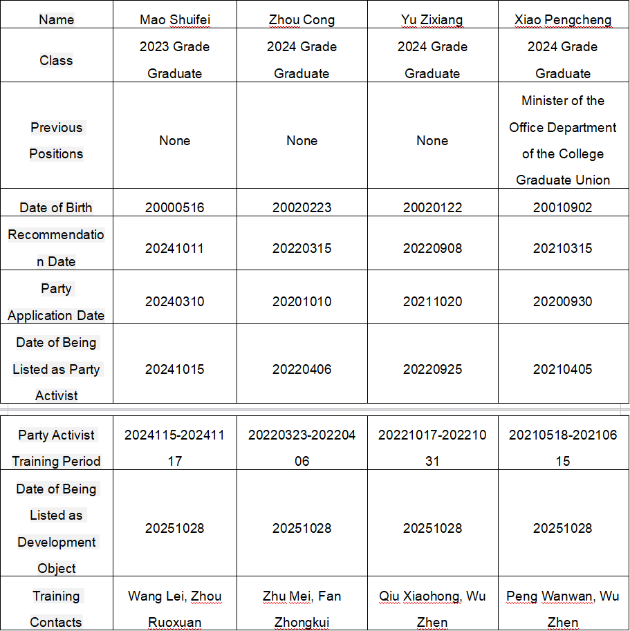 In accordance with the relevant provisions of the university's Party member development work, 4 comrades including Mao Shuifei have been identified as Party member development objects, and the list is now publicly notified. If you have any objections, please reflect them in writing or in person to the Graduate Party Branch of the School of Software Engineering within 7 days (Tel: 13199511657, Office: Room B205, Comprehensive Laboratory Building) or to the Party Committee of the School of Software Engineering (Tel: 0791-83858322, Office: Room 1307).